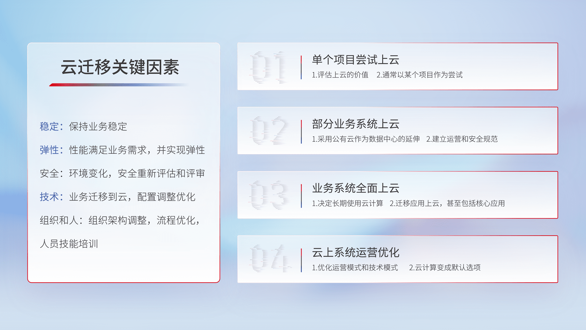 结合实际业务,,,,从规划设计、、、云平台选型、、、云原生改造、、、、数据迁移、、、集成交付,,,,迁移全过程为客户识别最佳上云路径,,,做好风险识别管理,,设计网络架构、、身份权限、、、安全审计合规、、操作审计、、、、日志审计、、监控告警策略、、、、多站点容灾设计等,,对云上基础设施进行整体规划,,提升IT治理水平,,,以满足弹性、、、、高可用、、高性能的需求。。