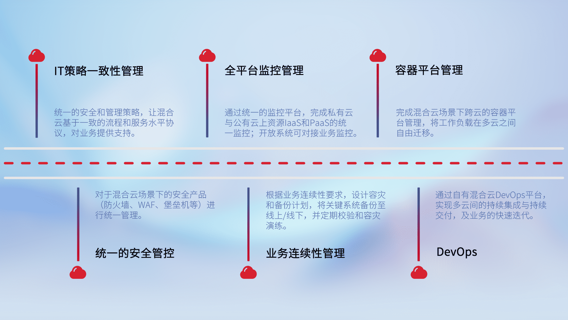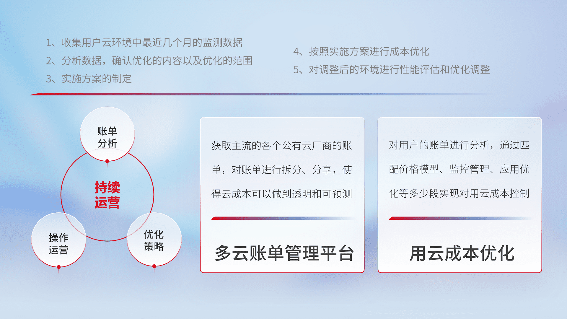 通过多云纳管,,,以统一的资源数据模型把客户的云资源进行抽象和封装,,,进而实现对多云资源的统一操作,,,保障云资源管理的可靠性、、、稳定性与可用性。。。。量身定制化运维内容,,配置、、开发运维、、补丁管理、、备份、、监控、、、认证和访问管理、、、审计和日常巡检等,,保障在用云过程中的可靠度,,,,稳定度以及高可用率。。