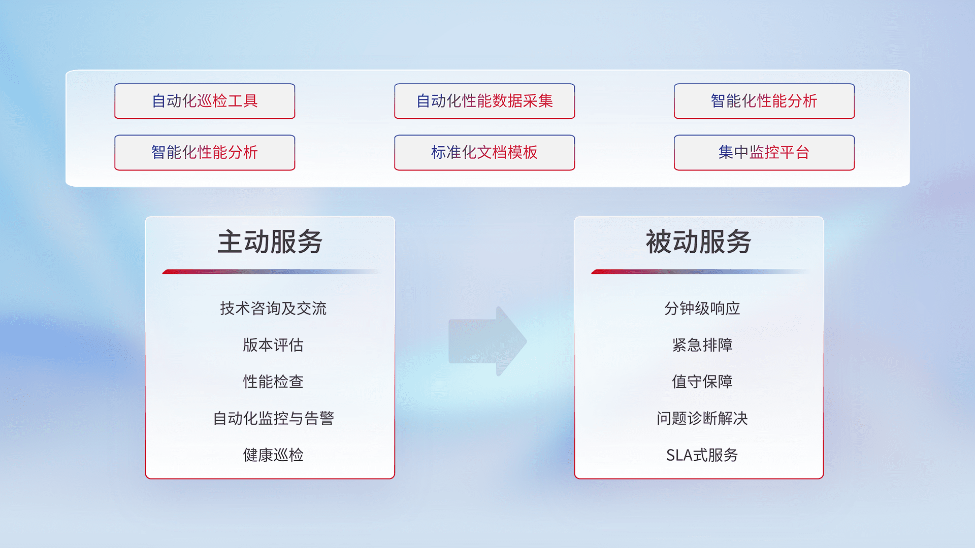 智能化工具和标准化文档,,,,保障服务质量,,,,提供主动服务(包含技术咨询、、、、版本评估、、、性能检查、、自动化监控与告警、、、健康巡检)和被动服务包含(分钟级响应、、、、紧急排障、、值守保障、、、问题诊断解决、、SLA服务)。。。。